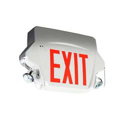 Exit Combination Unit, Battery Type: lead-calcium, Voltage DC: 12V, Battery Wattage: 25W, single face ceiling or wall mount, 120/347VAC, Legend Colour: red, Colour: factory white, self-powered, two lamps, Lamp Type: MR16 LED, Lamp Voltage: 6V, Lamp Wattage: 4W, Head Style: shielded, with canopy, Battery Run Time: 30 minutes