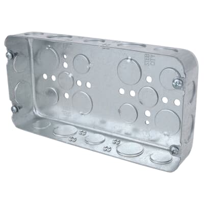 Three Gang Drawn Style Box, 58 Cubic Inches, 8-5/8 Inches Long x 4-1/2 Inches Wide x 1-5/8 Inches Deep, Drawn Construction with 1/2 Inch and 3/4 Inch Knockouts, For use with Conduit