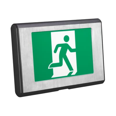 Pictogram Exit Sign, single face, universal mount, Arrows/Chevron Direction: standard film, Housing Colour: factory white, Faceplate Colour: brushed aluminum, Battery Type: nickel-cadmium, 120/347VAC, self-powered, Battery Run Time (Minimum): 120 minutes