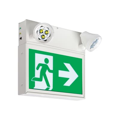 Pictogram Combination Unit, single face, Colour: factory white, Battery Type: lead-calcium, Battery Wattage: 28W, 120/347VAC, Voltage DC: 6V, one lamp, Lamp Type: MR16 LED, Lamp Voltage: 6V, Lamp Wattage: 4W, self-powered, Head Style: standard, Battery Run Time (Minimum): 30 minutes