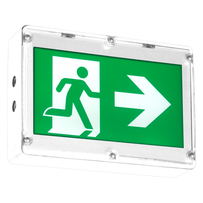 Pictogram Exit Sign, Unit Type: NEMA-4X & NSF, single face, Colour: factory white, 120 to 347VAC, 6 to 24VDC, cold-weather, Cold-Weather Temperature: -40°C