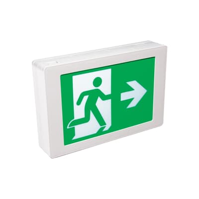 Arrows/Chevron Direction: none, Pictogram Exit Sign, single face, universal mount, Colour: factory white, 120 to 347VAC, 6 to 24VDC, Height of 8 inches (0.667 ft, 203.2 mm., 20.32 cm, 0.203 m), Length of 12.125 inches (1.01 ft, 307.975 mm., 30.798 cm, 0.308 m), Width of 2.125 inches (0.177 ft, 53.975 mm., 5.398 cm, 0.054 m)