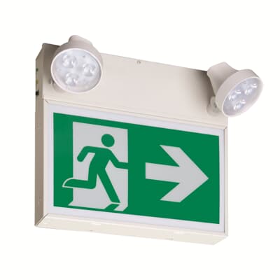 Pictogram Combination Exit Sign, single face, Colour: factory white, Battery Type: lead-calcium, Battery Wattage: 24W, 120/347VAC, Voltage DC: 6V, two lamps, Lamp Type: Built In LED, Lamp Voltage: 6V, Lamp Wattage: 24W, self-powered, Head Style: standard, Battery Run Time (Minimum): 30 minutes, counter
