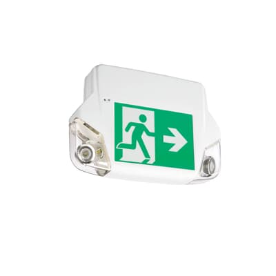 Pictogram Combination Unit, single face ceiling or wall mount, Colour: factory white, Battery Type: lead-calcium, Battery Wattage: 50W, 120/347VAC, Voltage DC: 6V, diagnostics, non-audible, self-powered, polycarbonate shield with tamper-proof screws, two lamps, Lamp Type: MR16 LED, Lamp Voltage: 12V, Lamp Wattage: 4W, Head Style: shielded, Battery Run Time (Minimum): 30 minutes