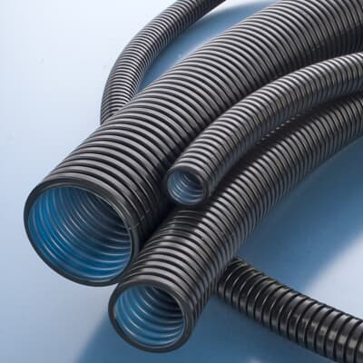 Coarse Profile Three Layer Corrugated Medium-Wall Very Flexible Conduit, (XCYL) Material - Outer Layer - Polyamide 6, Intermediate Layer - Bonding Compound, Inner Layer - Polyethylene Color - Outer Layer - Black, Inner Layer - Blue, Conduit Size NW - 36