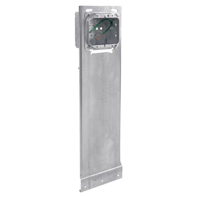 Pre-Fabricated, Single Gang Outlet Box, 30.3 Cubic Inches, 4 Inch Square x 2-1/8 Inch Deep, 1/2 and 3/4 Inch Eccentric Knockouts, 5/8 Inch Raised Box Cover, with Grounding #12 AWG Solid Ground Wire Pigtail, C-3 Armored Cable Clamp, and 18 Inch Vertical Mounting Bracket, For Use with Armored/Metal Clad Cable