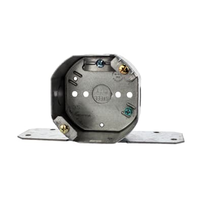Octagon Ceiling Fan Support Box, 22.5 Cubic Inches, 4 Inch Diameter x 2-1/8 Inches Deep, 1/2 Inch Knockouts, Pre-Galvanized Steel, Drawn Construction, Non-Metallic Cable Clamp (C-5) and F Bracket, For use with Non-Metallic Sheathed Cable