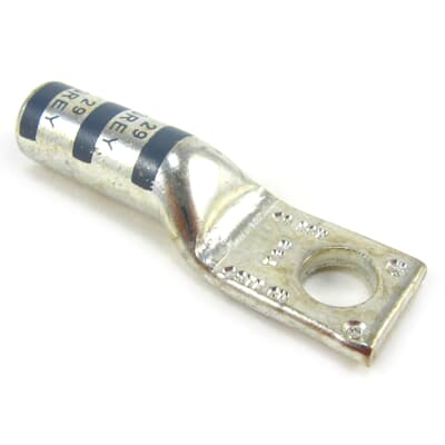 Cosse à un trou en cuivre. Douille allongée, certifiée à 600 V et recommandée jusqu"à 35 kV. Grosseur de boulon 1/4 pouce. Calibre de fils ordinaire #4 AWG. Code de matrice 29, code couleur gris. Trou de regard.