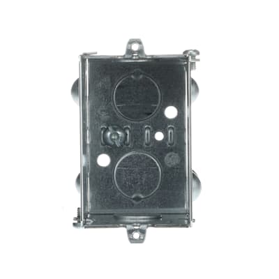 Boîte pour appareil groupable. 3 pouces de haut x 2 pouces de large x 2-1/2 pouces de profond volume de 12,5 pouces cube. Déboucures concentriques (1/2 et 3/4 pouce).
