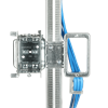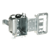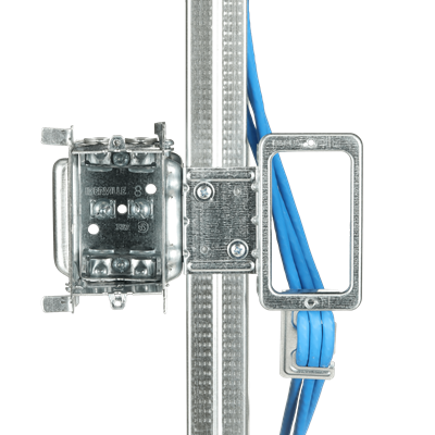 Boîte Puissance/Communication groupable, 3 po de haut x 2 po de large x 2-1/2 po de profond avec une capacité de 16 pouces cube. Brides pour câbles armés ou pour câbles sous gaine non-métallique. Équerre de montage pour installation sur colombage d'acier avec support de câble basse tension intégré. Équerre de montage positionnée pour une épaisseur de cloison sèche de 1/2 po.