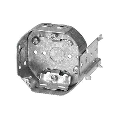 Boîte octogonale 4 pouces 1-1/2 pouces de profond capacité 15 pouces cube. Équerre de fixation. (Avec pointes de fixation et guides de positionnement).