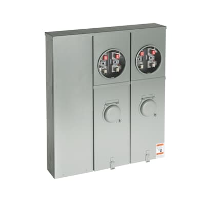 Socle de compteurs 200 ampères par position, monophasé 120/240 volts. Souterrain. 2 groupes, fourni avec 2 disjoncteurs Siemens (QJ) 2 pôles 200 ampères 10 kA.