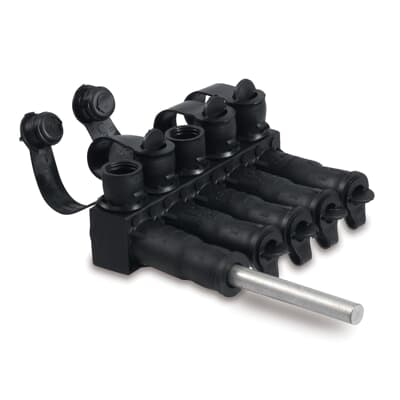 Maintient une pression uniforme de boulonnage sur les conducteurs. Assure le maximum de pression conducteur-contact. À installer dans des transformateurs montés sur poteau avec des raccords basse tension à boulons à oeil. Assure une connexion complètement isolée, étanche à l’eau. |