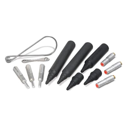 Storm Safe Breakaway Service Entrance Kit - Single Service and Reduced Neutral, Triplex Block for #2, #2 and #4, Dual Rated for Aluminum or Copper, 750 pound Break Force. Includes Insulating (Two Long Rockets, One Short Rocket, Two Caps), One Breakaway Link Bail, One Stainless Steel Link - SSL 750, Three Copper Pin Terminals with Grease and Capped, Three Female Connectors/Couplers (Uses Dies TU 52 BG 243 5/8) with Compound and Caps.